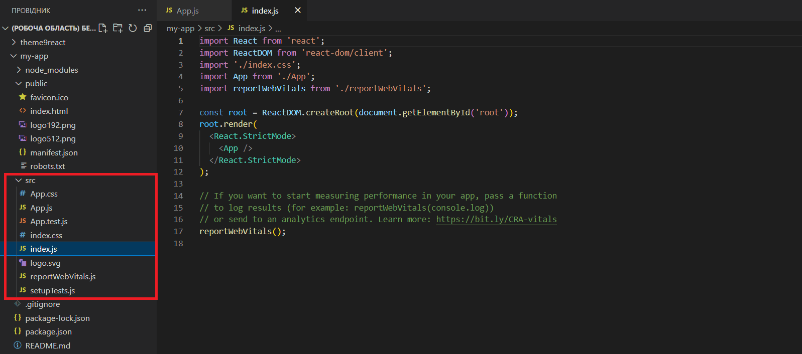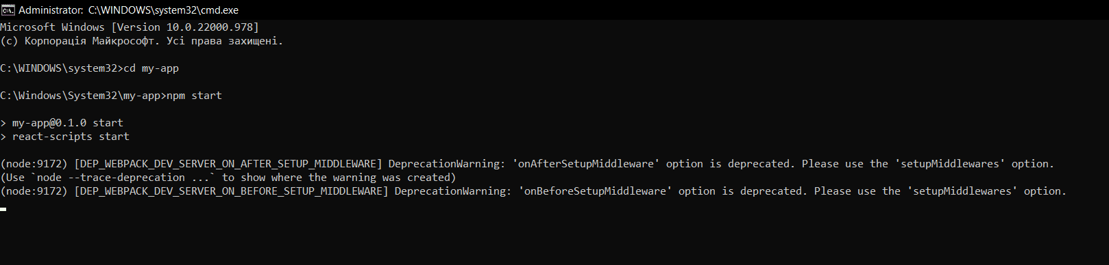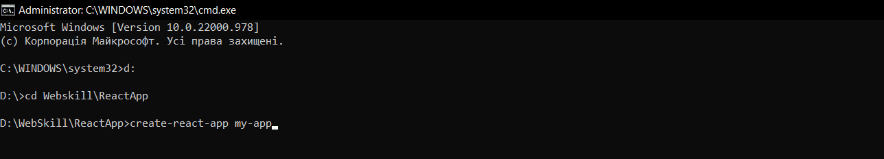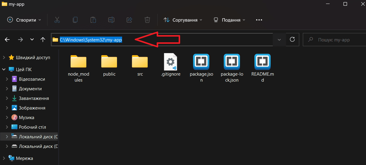 Використовуємо команду cd my-app щоб відкрити папку із нашим додатком