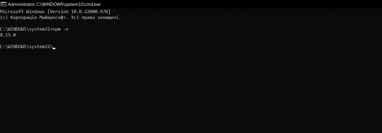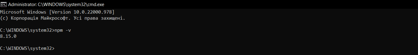 Прописуємо одразу команду npm -v таким чином дізнаємось яка версія нашого Node.js