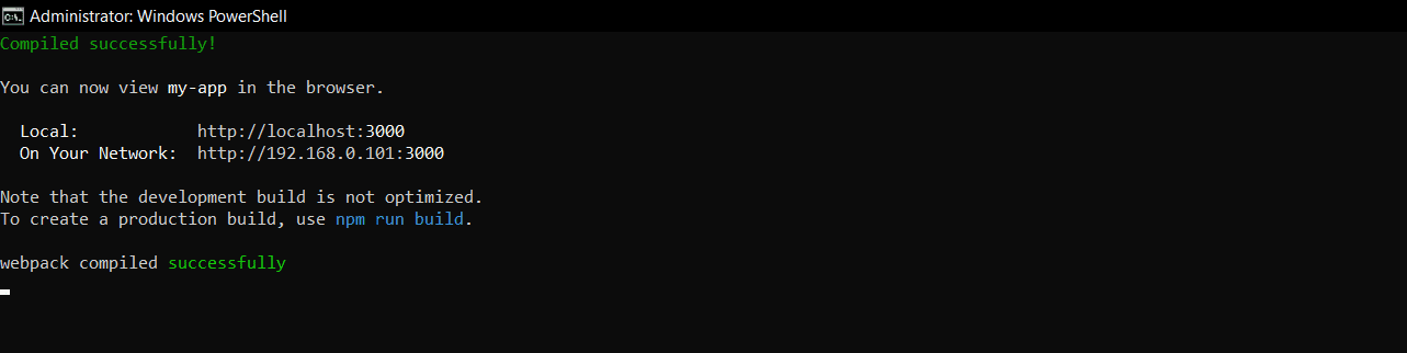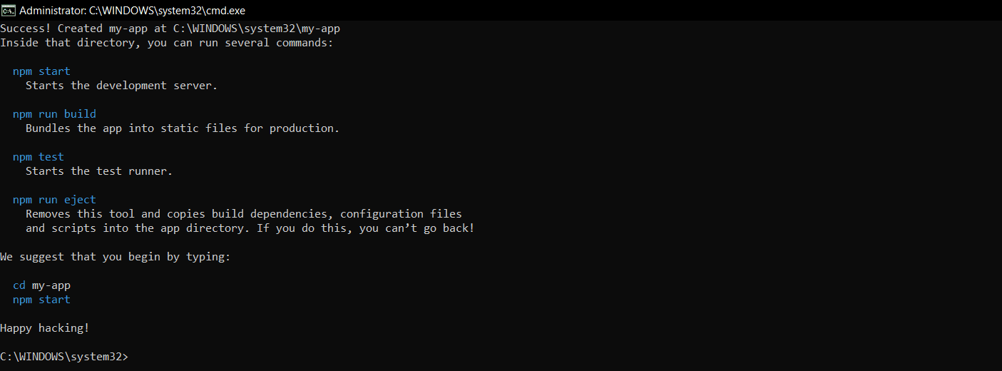 Після завершення створення вашого React додатку, у вас появиться напис Happy hacking!